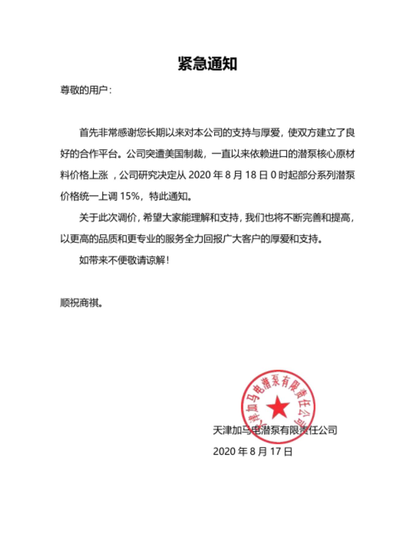 首先非常感谢您长期以来对本公司的支持与厚爱,使双方建立了良好的合作平台。公司突遭美国制裁,一直以来依赖进口的潜泵核心原材料价格上涨 ,公司研究决定从2020年8月18日0时起部分系列潜泵价格统一上调15%,特此通知。